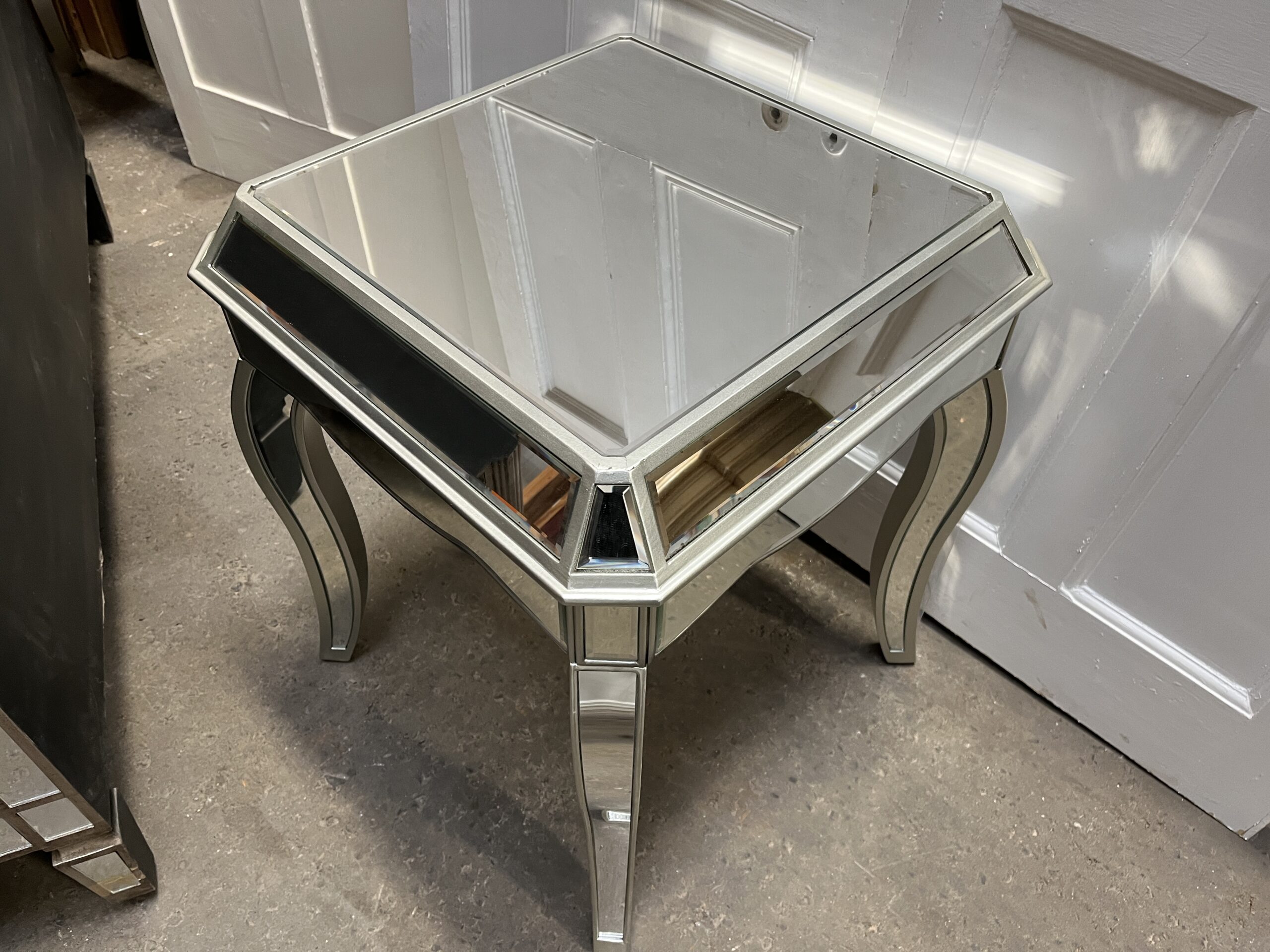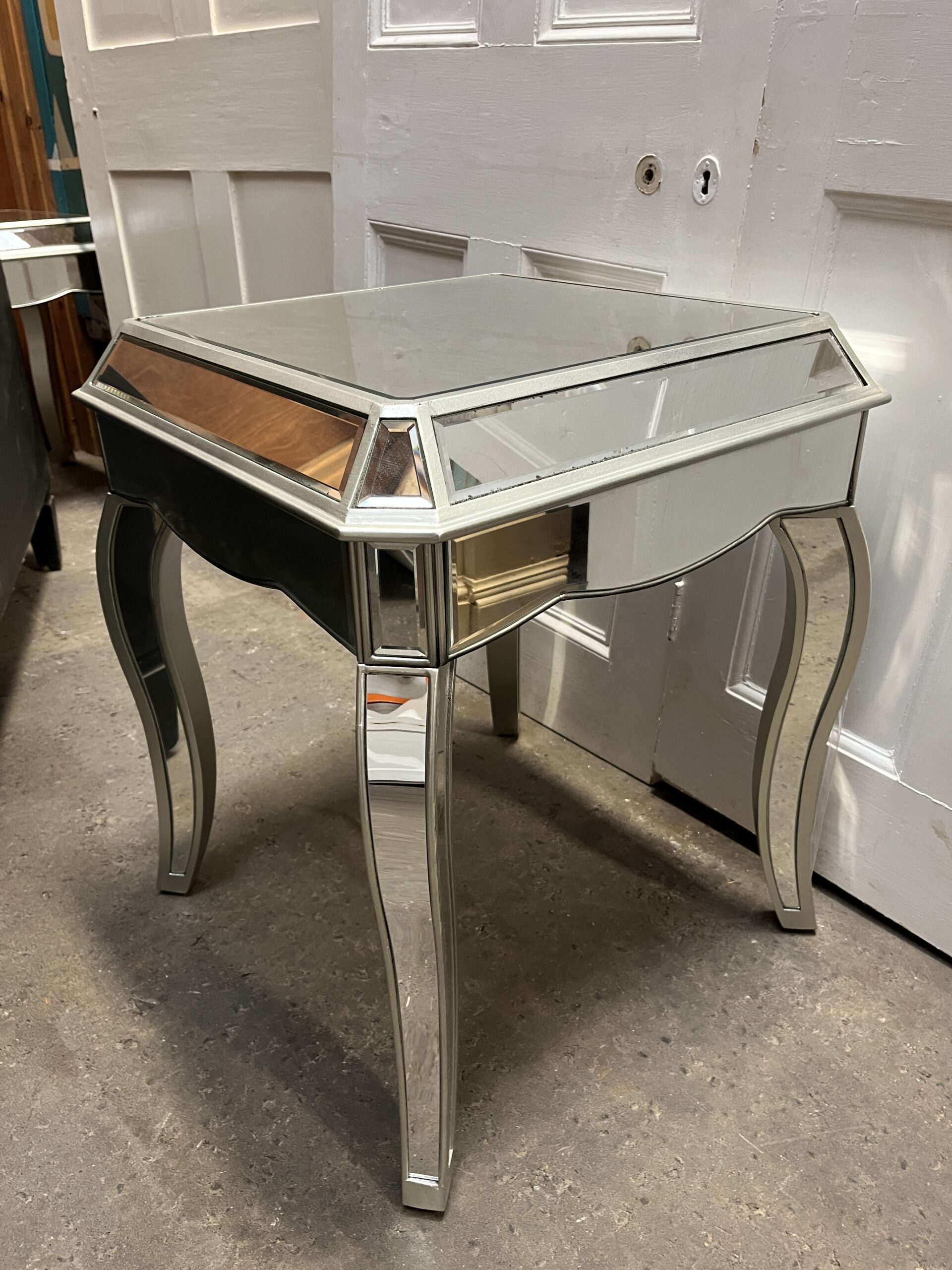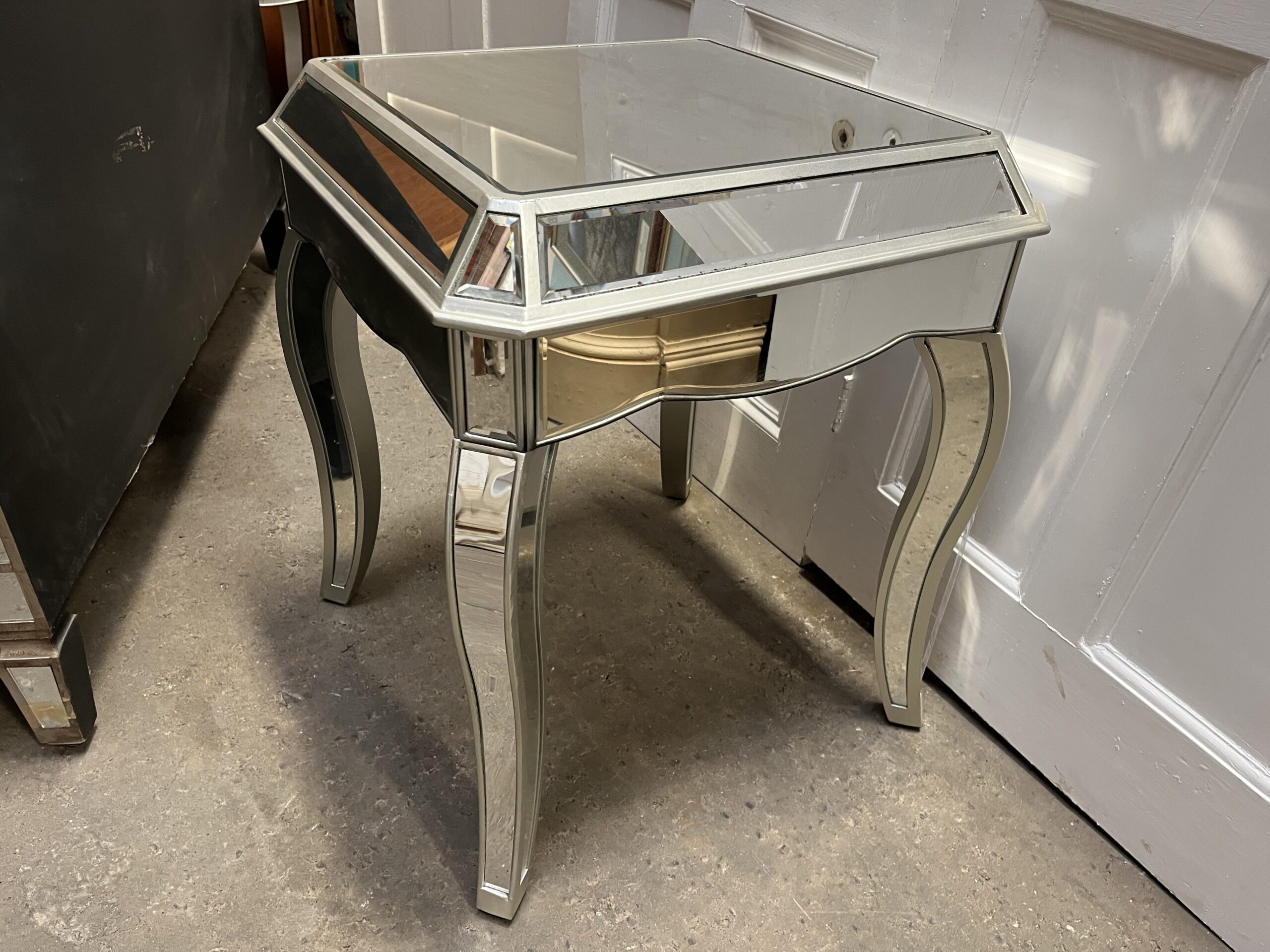 Mirrored Side Table/Vintage Distressed Look Silver Painted Bevelled Mirror Lamp Table With Cabriole Legs.