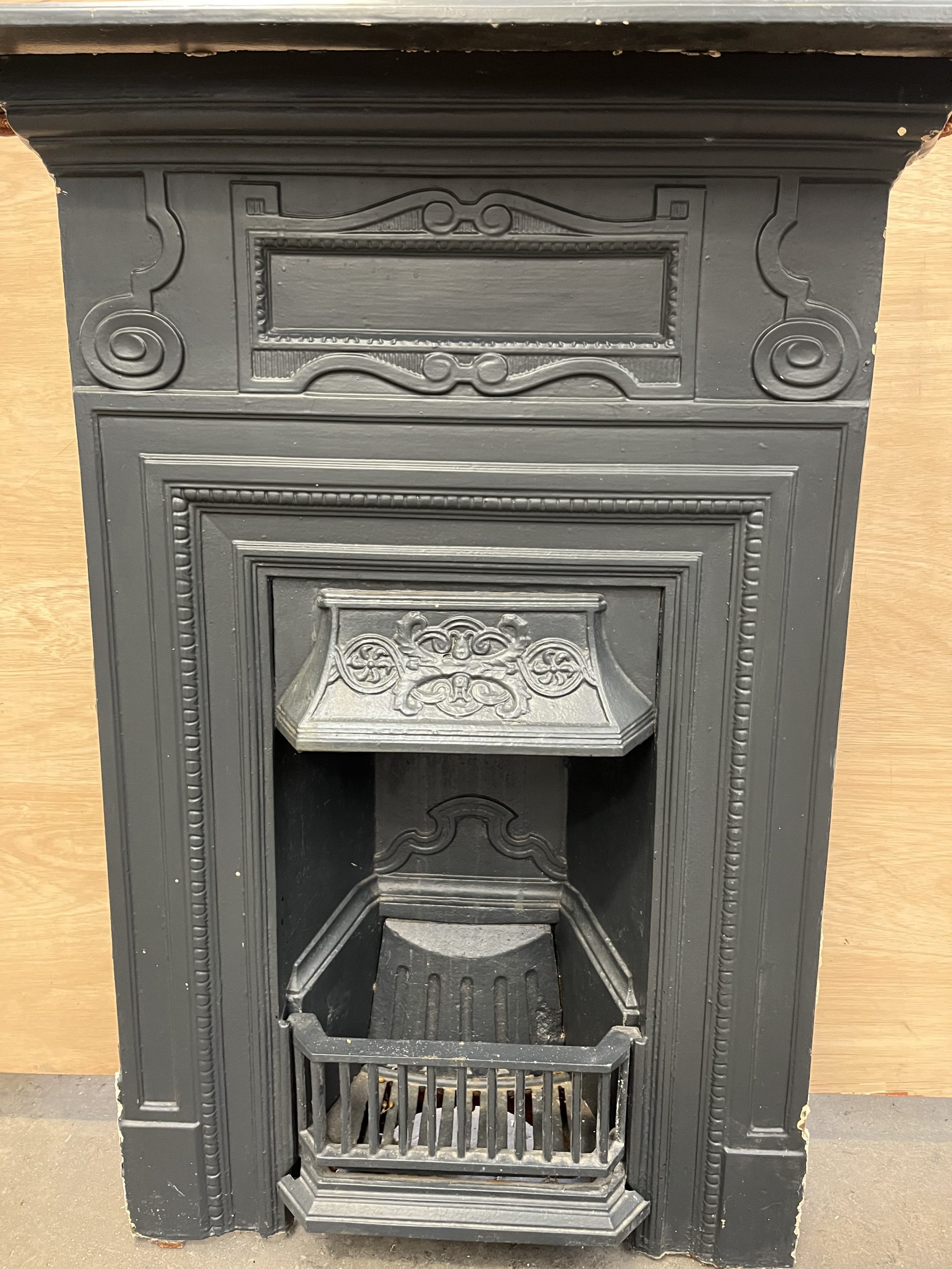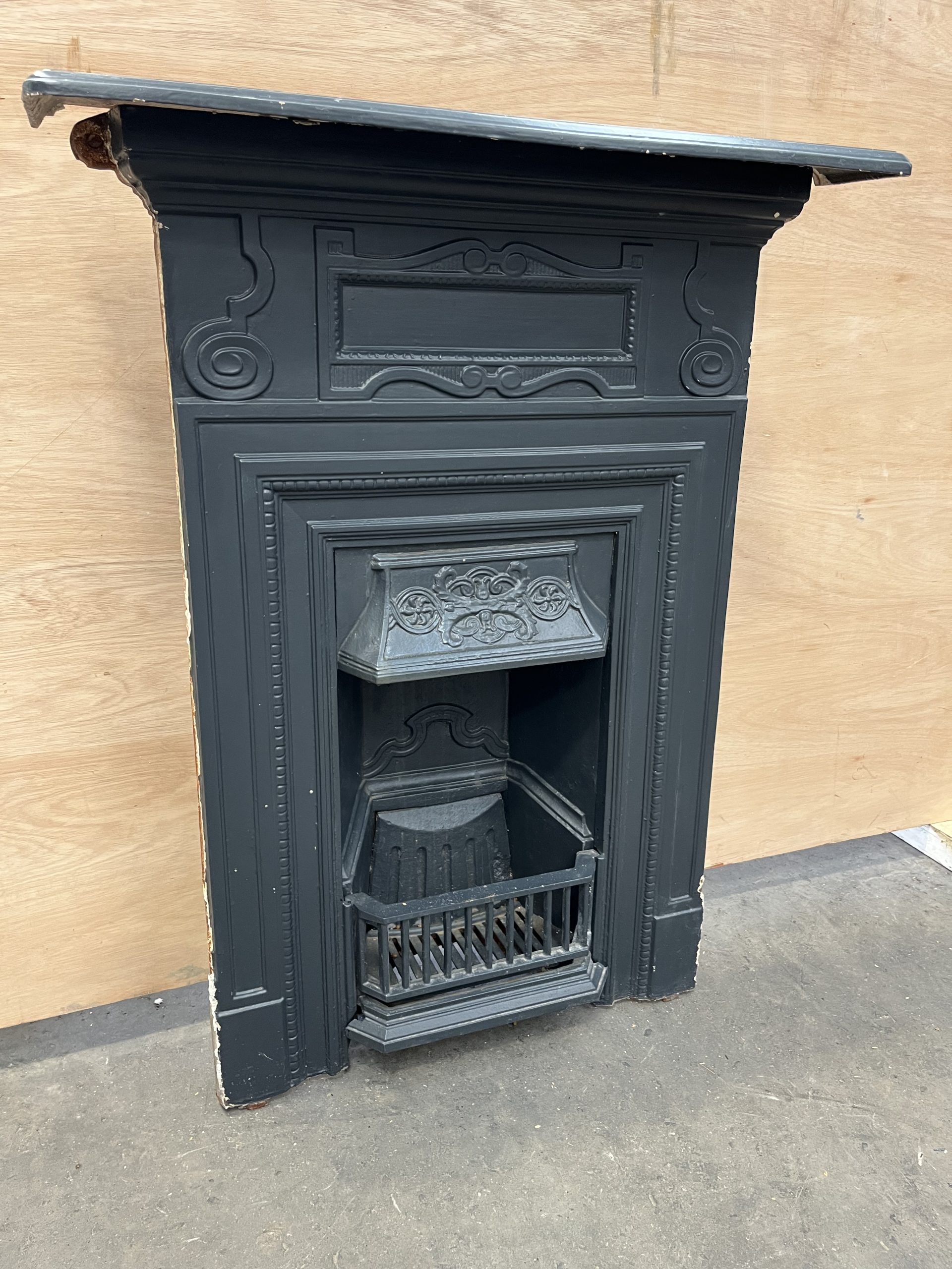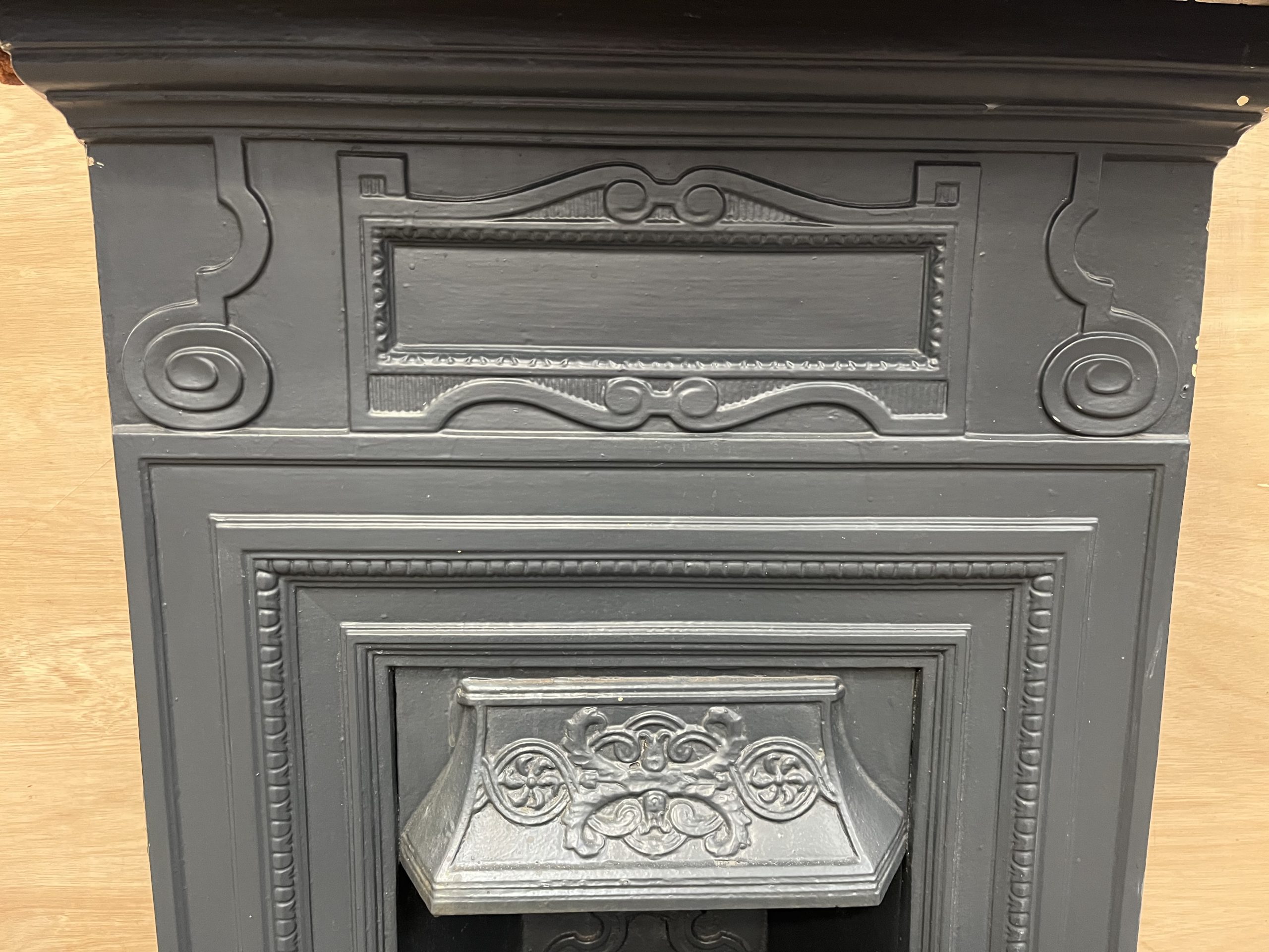 An original Victorian cast iron fireplace combination arch insert, painted dark Grey.