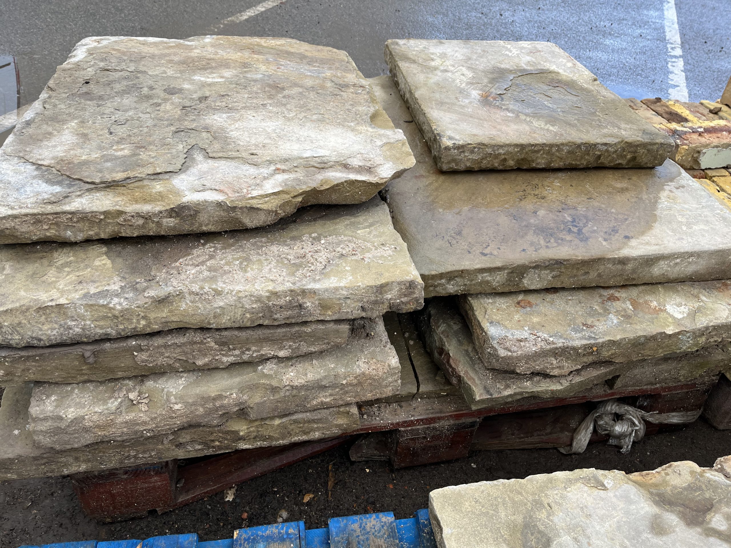 Reclaimed York Stone Flags /York Stone Flagstone Paving. Naturally weathered stone . Sought after naturally weathered York Stone. Random sizes, thickness 2" -3". Reclaimed condition with weathered surfaces and edges.. Call:01843 821555 option 4   Email:reclamation@dds-group.co.uk  Price: @£110/m2+vat