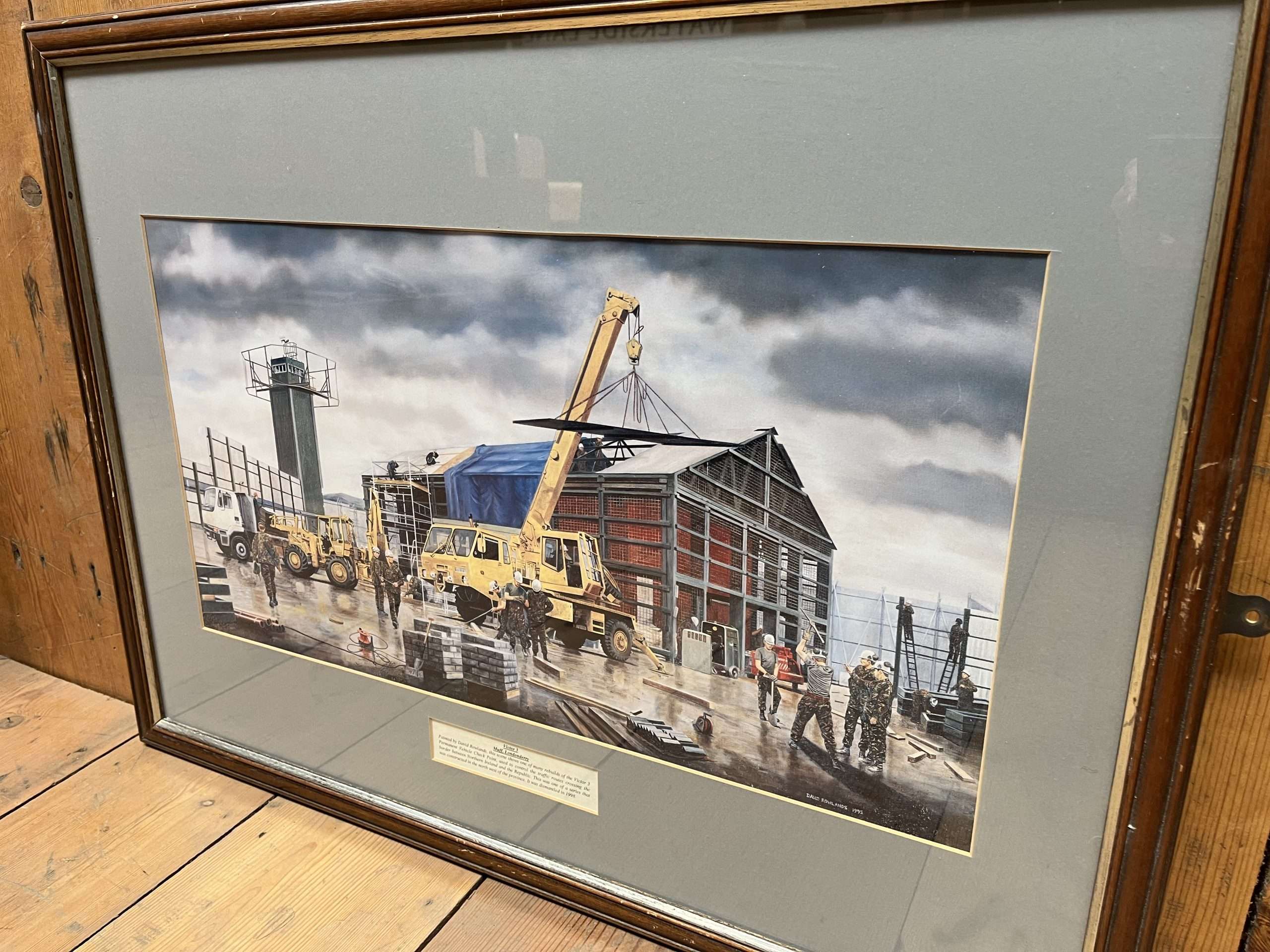 Royal Engineers Framed Art Print from Brompton Barracks by David Rowlands 1995. "Victor 3, Muff, Londonderry" Painted by David Rowlands, this scene shows one of many rebuilds of the Victor 3 Permanent Vehicle Check Point, used to control the traffic routes crossing the border between Northern Ireland and the Republic. This was one of a series that was constructed in the north west of the province. It was dismantled in 1998. Listing is for 1 framed Print, as pictured, good condition, a few minor marks, annotations/hand written notes on reverse, sold as seen, in "as is" condition for collection. Call:01843 821555 option 4   Email:reclamation@dds-group.co.uk  Price: £90 Inc Vat each