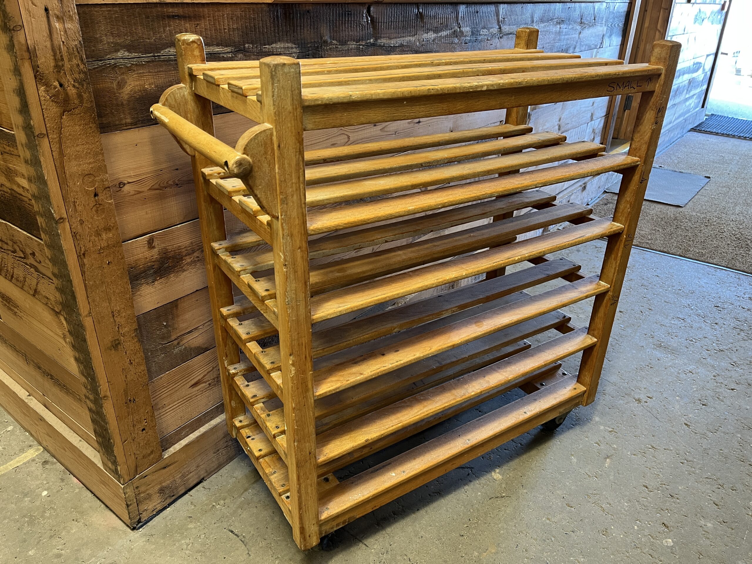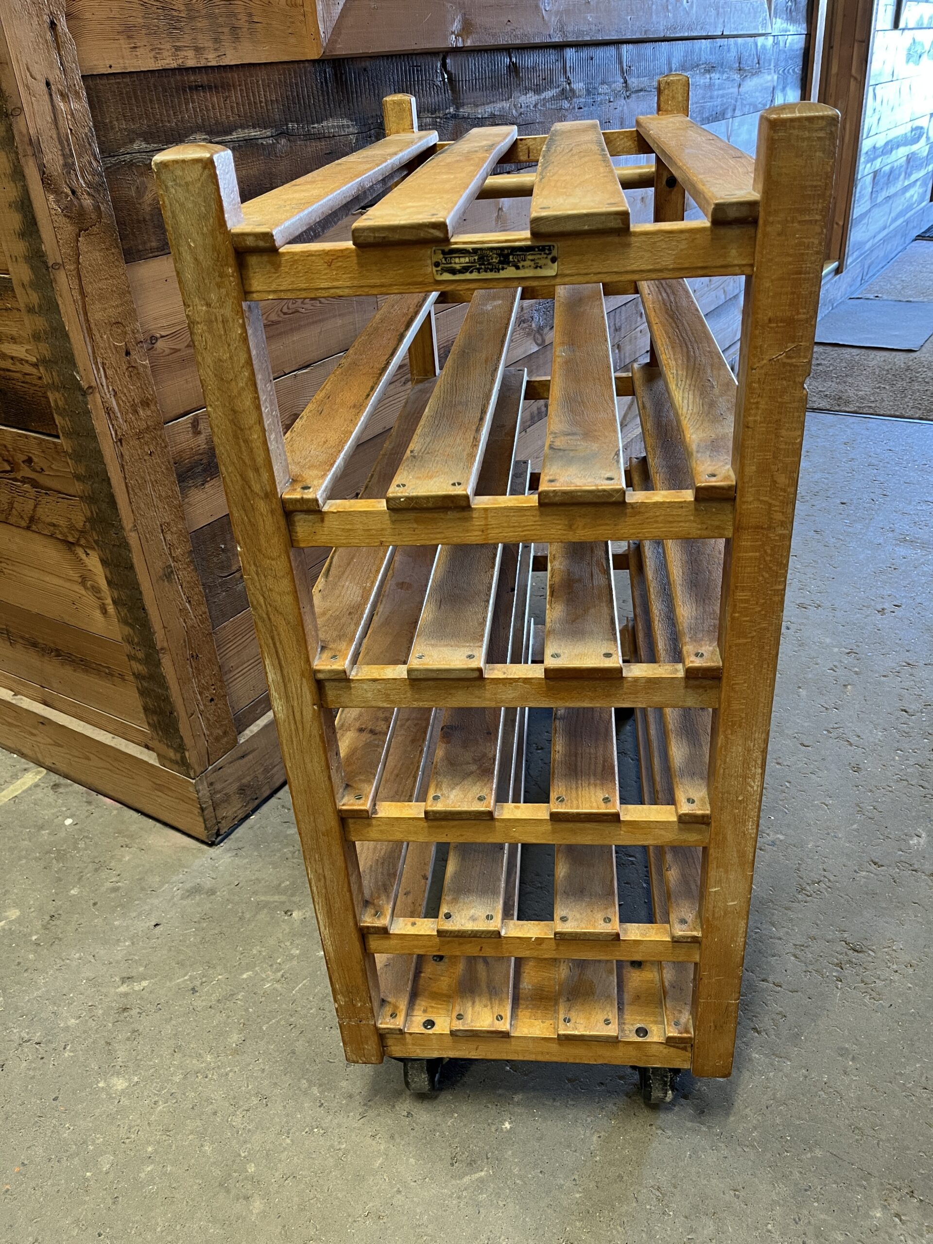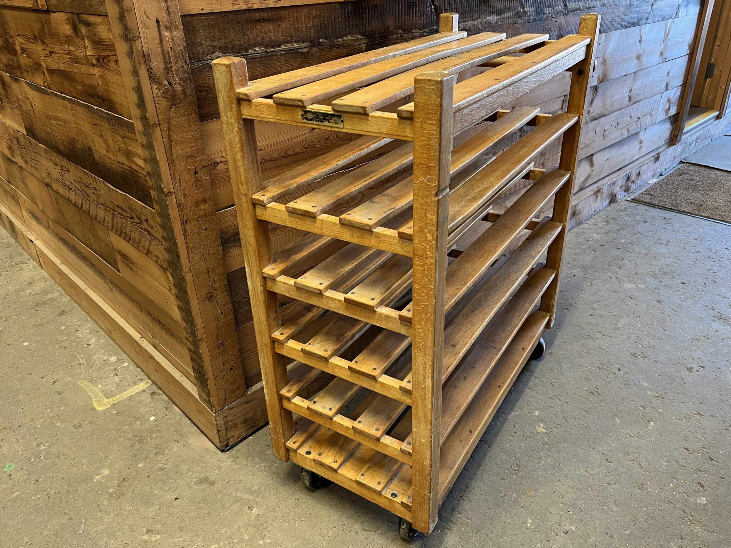 Vintage Wooden Bakers Trolley/ Reclaimed Wooden Slatted Shelf unit On Castors. Approx. size: 1035mm wide x 850mm high x 457mm depth x 1115mm height. Ideal for Theme Events/ Photo/ TV / Film Props. Signs of age, wear, marks, patina, good original colour & character. See pictures for example condition. Sold in "as is" condition. Call:01843 821555 option 4   Email:reclamation@dds-group.co.uk  Price:£175 Inc Vat
